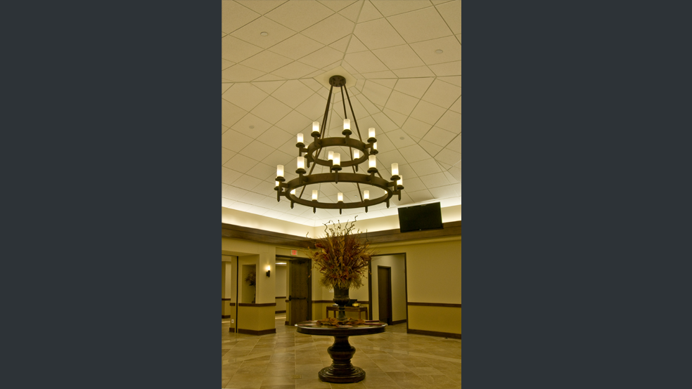 A custom made pendant, which coordinates with sconces throughout the space, was designed in conjunction with a church committee in order to get the perfect size, scale, height, and look for the large vaulted welcome center. A perimeter cove gives a bright and welcoming feel as people congregate before entering the main worship space.